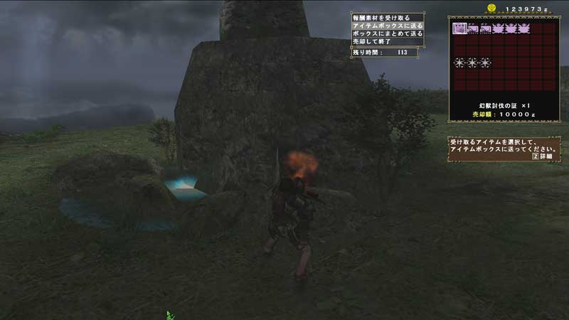 クエ開始後モドリ玉でBC帰還。エリア2で火事場発動させつつガブラス掃除。