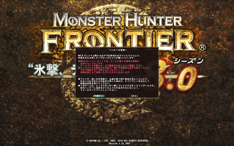 | ハンターの皆様へ MHFをプレイする際には必ず下記事項をお守りいただいた上で、 狩猟生活をお楽しみくださいますようお願いいたします。 ●MHF公式メンバーサイトでは、ゲームに関する重要な情報を お知らせしております。 ゲームプレイの際には、必ず最新のお知らせをご確認ください。 ●ゲームプレイを開始される前に、MHF利用規約を必ずお読みください。 下記【同意する】を押されたことをもって、 規約内容にもご同意いただいたものとみなします。 ●プレイ中、強い光の刺激や、点滅を繰り返す画面を見たことにより、 めまいや吐き気などの症状を感じた場合は、すぐにプレイを中止して、 医師の診察を受けてください。 ●このゲームは、たくさんの人が一緒にプレイをするオンラインゲームです。 他のハンターに迷惑をかけるような行為を行わないよう、 マナーを守ってプレイしてください。 【同意する】 【戻る】 |