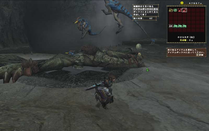 まあこういう理由で「女ハンターである私一人だけで他のメンツ分(残りは全員男ハンター)まで石稼ぎ出来るかなあ」と不安になる。ぶつくさ言ってても仕方ないのでセトラーソードを持ってゴー。ビジュアル良し性能良しで持ってて良かったセトラーソード!!(2ndキャラ故、他にまともな片手は持ってません。)