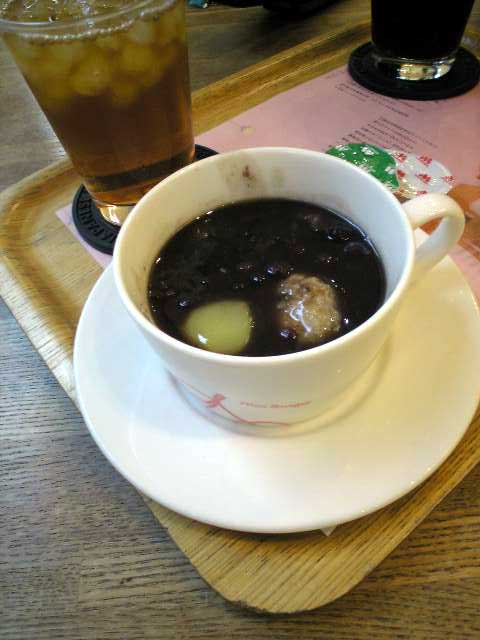 この店舗限定かどうかは分からないが、メニューにケーキセットがあった。夕方過ぎてたどり着いたのでこの時はケーキも2種類くらいしかなかったけど、普段は5。6種類くらいあるっぽい。それを横目にいつもの様に私は玄米餅のおしるこを食べるのですが。